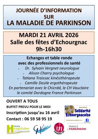 Journée d'information sur la maladie de Parkinson le mardi 21 avril 2026 à la salle des fetes d'Echourgnac de 9h à 16h30.