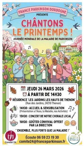 Nous avons l'honneur et le privilège d'accueillir France Parkinson Dordogne au sein de la résidence des jardins des hauts de thenon le 26 mars à 14h30.