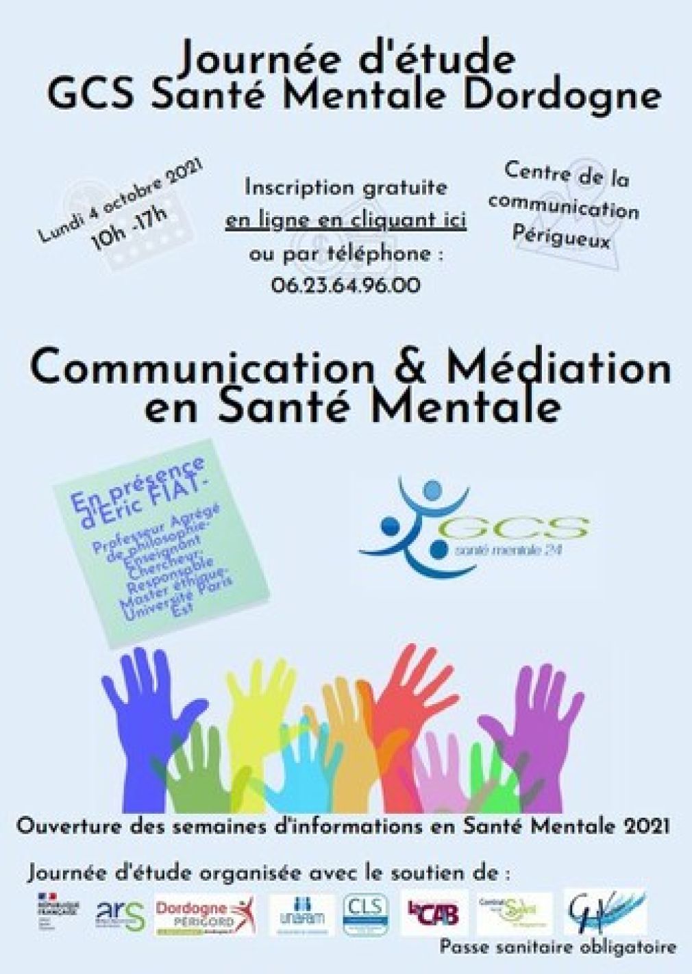 Le GCS santé mentale organise une journée d'étude et d'échanges le Lundi 4 octobre 2021 à la salle de la Communication à Périgueux sur le thème Communication et Médiation en santé mentale.
