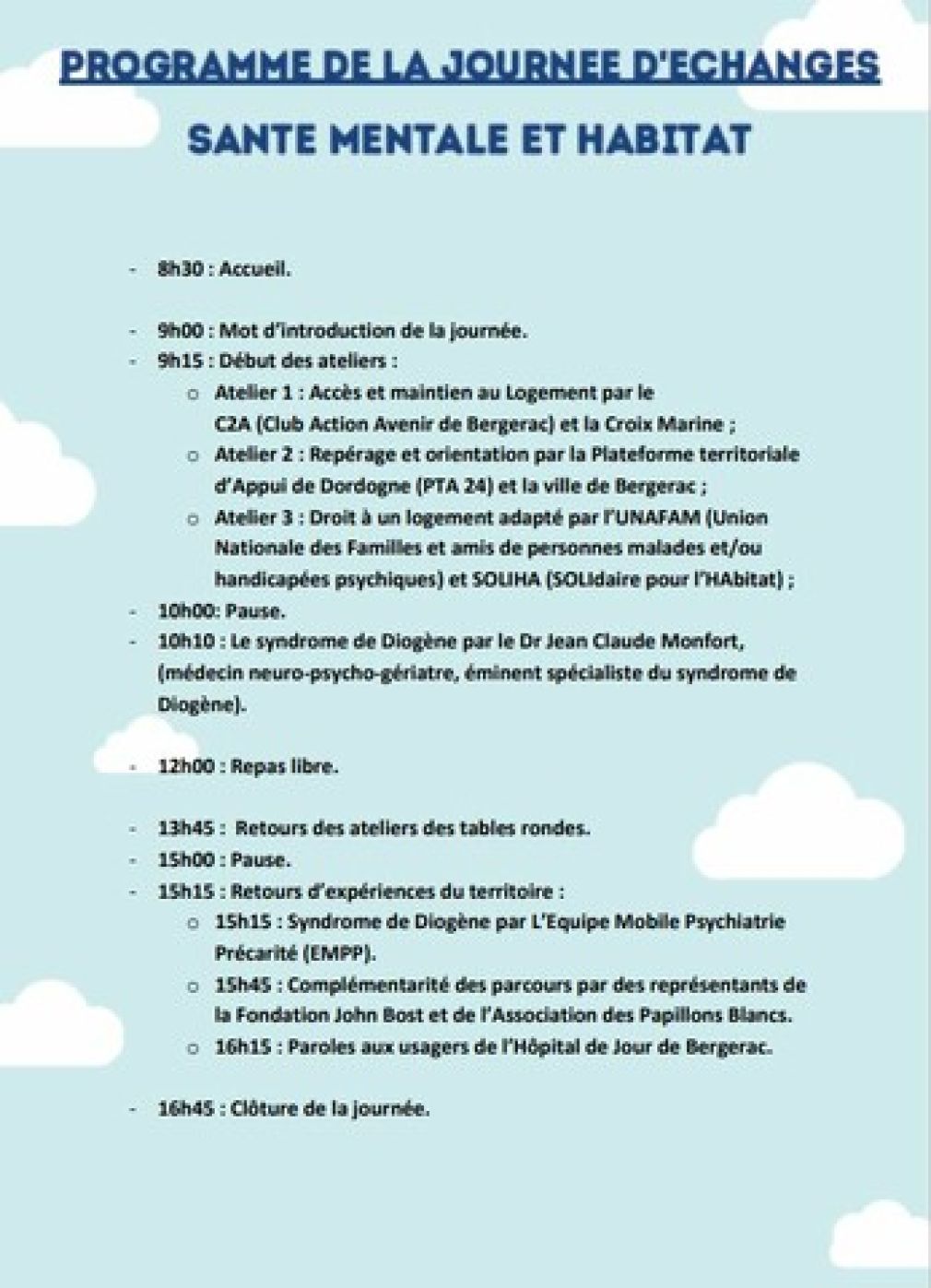 Les acteurs du territoires: La Communauté d'Agglomération Bergeracoise, le Centre Hospitalier Vauclaire, L'Association des Papillons Blancs, la Fondation John Bost, le C2A (Club Action Avenir de Bergerac), la Croix Marine, la Plateforme territoriale d’Appui de Dordogne (PTA 24), la ville de Bergerac, l’UNAFAM (Union National des Familles et amis de personnes malades et/ou handicapées psychiques), SOLIHA (SOLIdaire pour l’Habitat), l’Equipe Mobile Psychiatrie Précarité et l'hopital de jour de Bergerac ont le plaisir de vous inviter à la Journée Santé Mentale et Habitat, qui a lieu le