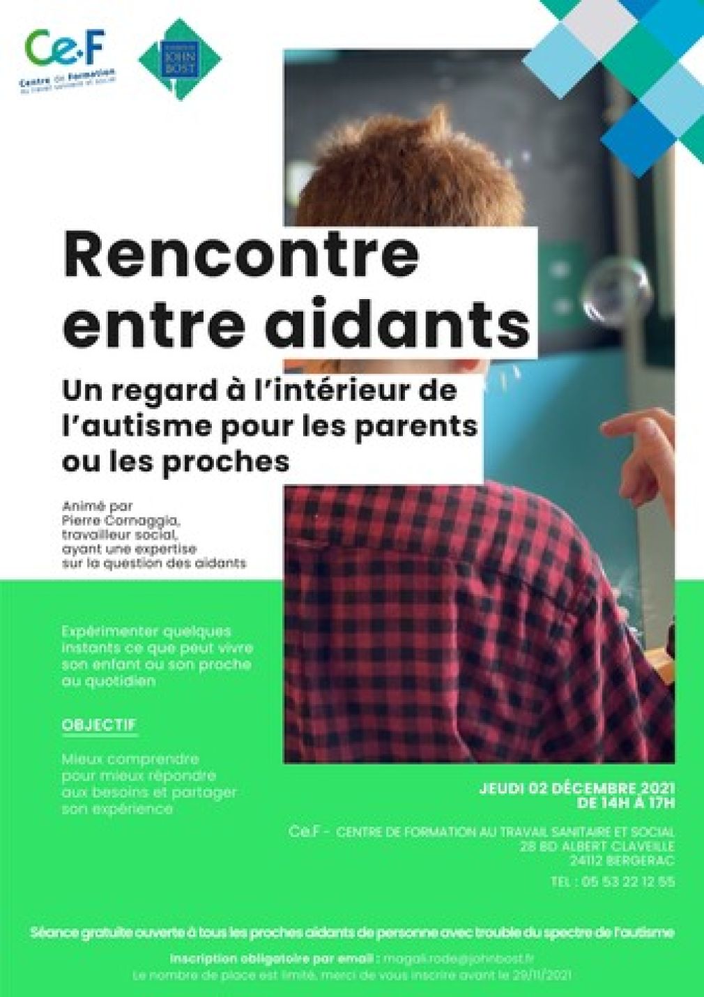 Le Centre de Formation de la Fondation John Bost a le plaisir de convier les proches-aidants de personnes porteuses d’autisme à participer à cette rencontre gratuite. Il propose ainsi un espace d’informations, d’échanges, d’écoute et de partage d’expériences aux proches aidants.