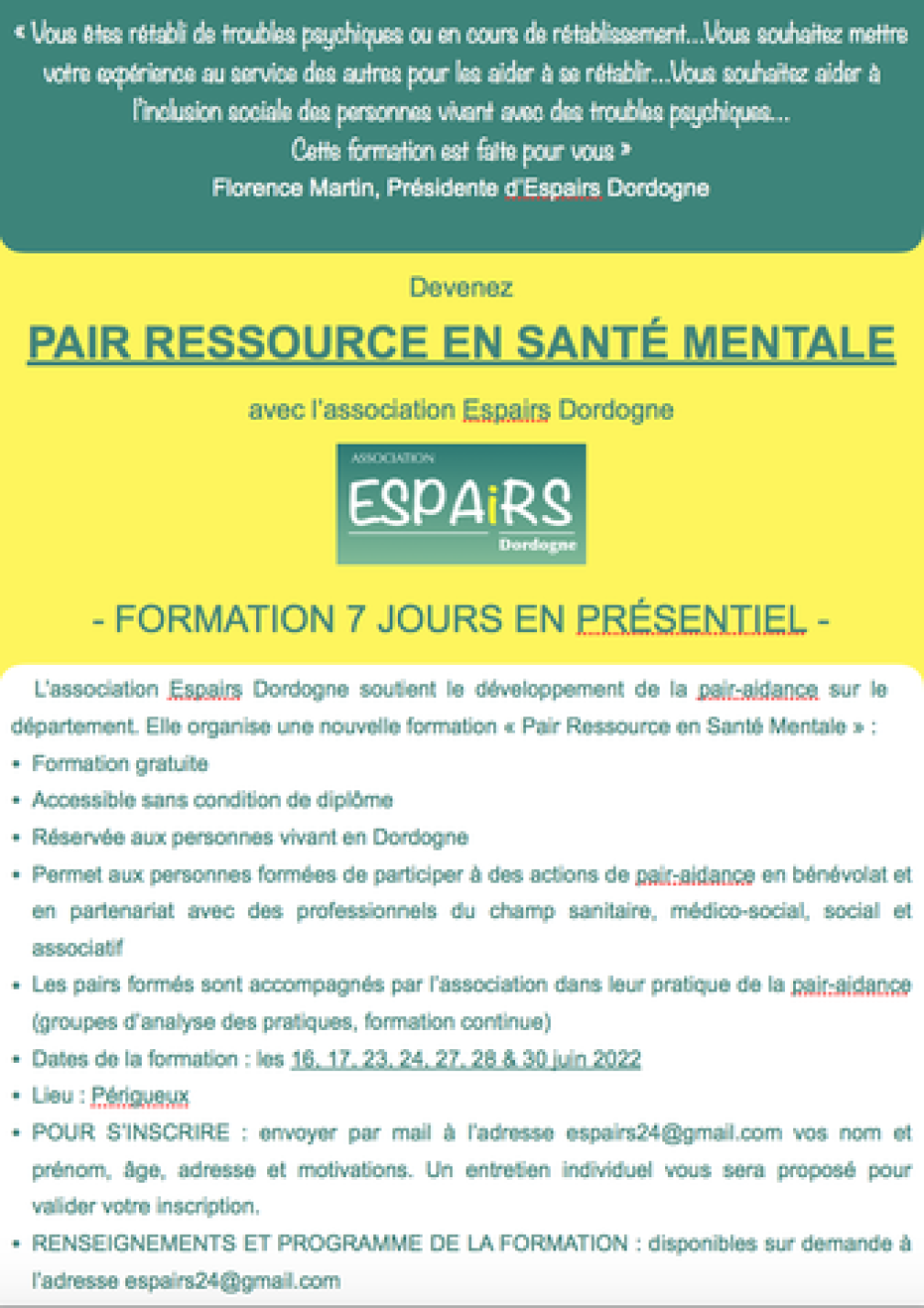L'Association ESPAIRS Dordogne soutient le développement de la pair aidance sur le département. Si vous êtes rétabli d'un trouble psychique ou si vous êtes en cours de rétablissement, Florence Martin, la présidente de ESPAIRS 24 a un message pour vous: