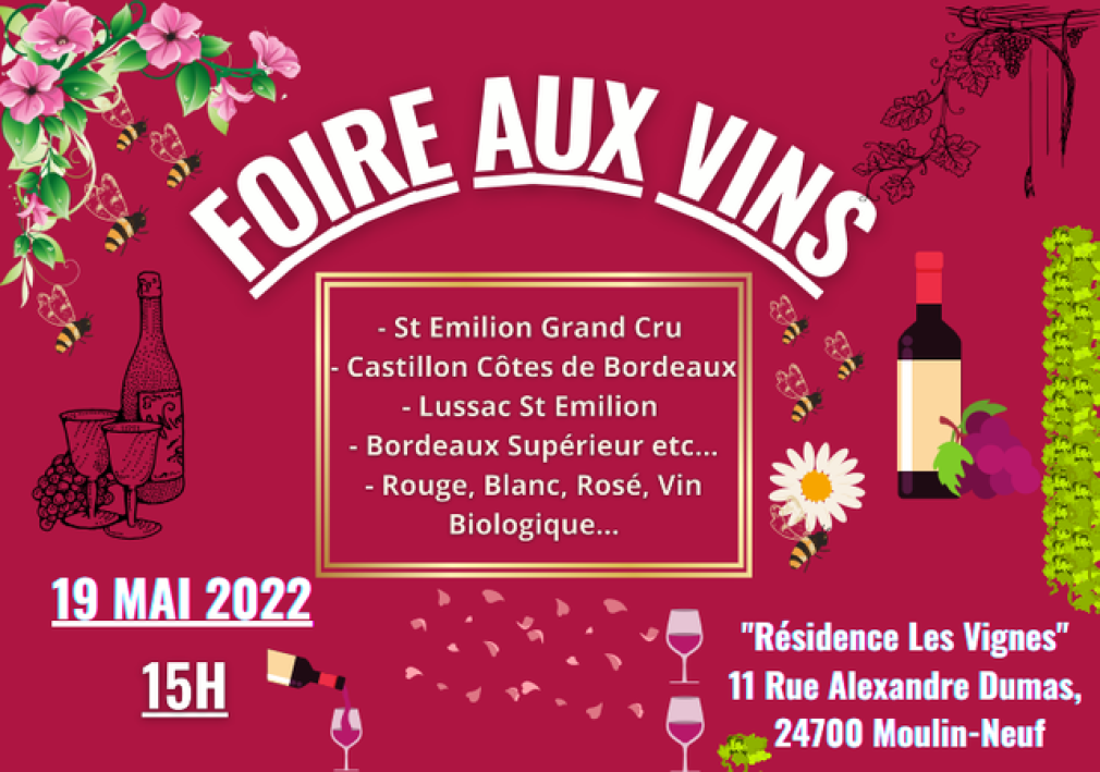 La Résidence les Vignes de Moulin Neuf organise une Foire aux Vins le Jeudi 19 mai 2022 à 15h.