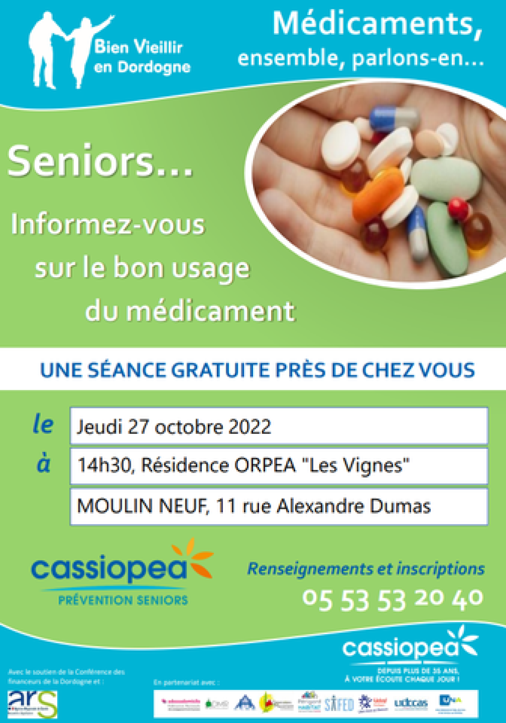 Dans le cadre du programme "Bien vieillir en Dordogne", nous vous informons que CASSIOPEA Prévention Séniors organisera prochainement une séance de prévention en partenariat avec la Résidence de Moulin Neuf sur la thématique: