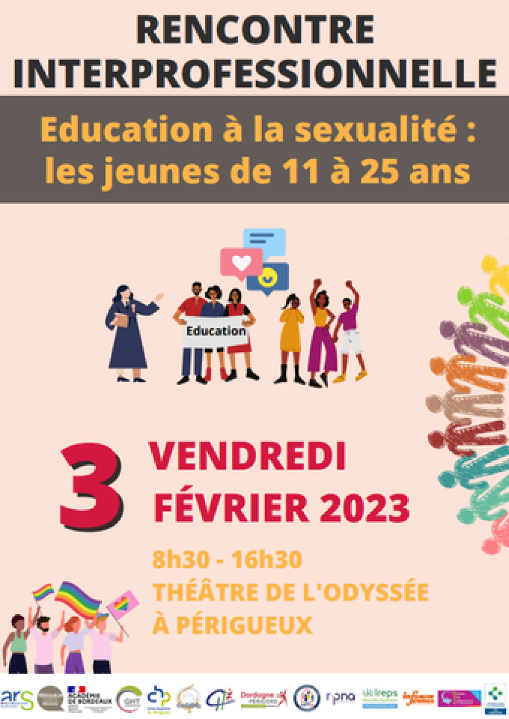 Le Vendredi 03 Février 2023 une rencontre interprofessionnelle est organisée au théâtre de l'Odyssée à Périgueux autour de l'éducation à la sexualité destinée aux professionnels en contact avec des jeunes de 11 à 25 ans ayant des fonctions d'éducation, d'insertion, de prévention ou de soin amenés à répondre à des questions sur ce sujet. Cette action aura lieu de 9h à 17h.