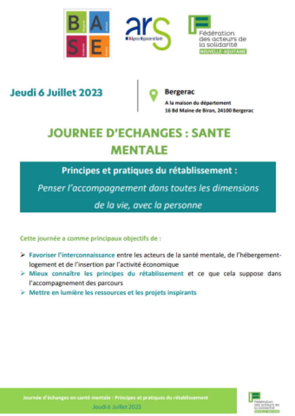 Le 6 Juillet 2023 à Bergerac à la Maison du département à partir de 9h pour la journée Santé Mentale: Principes et pratiques du rétablissement- Penser l'accompagnement dans toutes les dimensions de la vie, avec la personne.