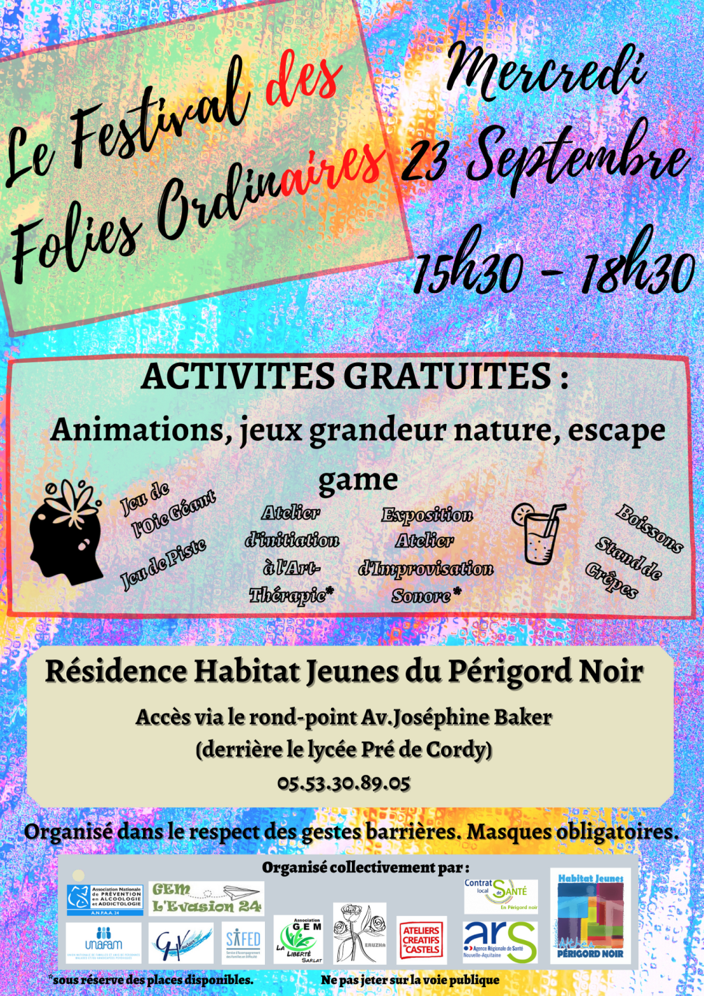 Au programme jeu de l'Oie Géant, jeu de piste, atelier d'improvisation sonore, atelier d'initiation à l'art-thérapie, escape game et bien d'autres. Et que serait un festival sans son stand de crêpes et de boissons (sans alcool) ! Les objectifs de cette manifestation ? S’amuser bien-sûr mais aussi apprendre sur le bien être mental au sens large, de nombreux facteurs pouvant avoir des effets sur elle : la sexualité, les préjugés, la maladie - mentale ou non, les addictions, le rapport aux parents… L’évènement est co-organisé par le Contrat Local de Santé du Périgord Noir et la Résidence Habitat Jeunes du Périgord Noir et regroupera de nombreux partenaires : le Centre Hospitalier Vauclaire à Montpon Ménestérol, le SAFED 24, l'ANPAA 24 et le Réseau Info Jeunesse avec la Caravane des Folies ordinaires seront présent, mais aussi les Groupes d’entraide mutuelle de Sarlat et Terrasson, l’Unafam 24, la Compagnie Keruzha, Les Ateliers Créatifs de Castels. Pour cette occasion, la caravane accueillera un médiateur santé pair en santé mentale. Masque obligatoire.